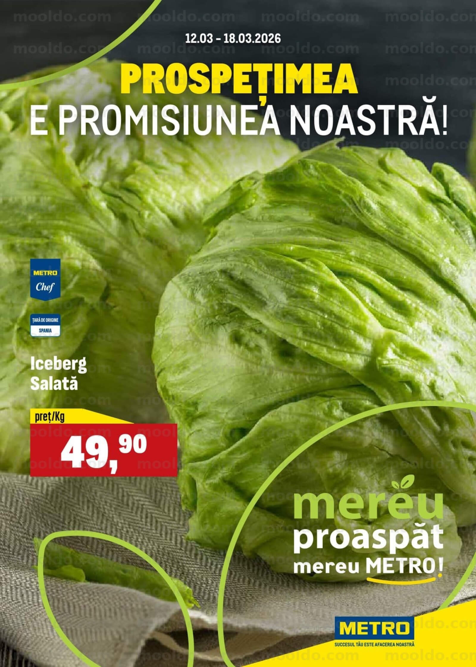 Răsfoiți acest catalog METRO actual în perioada 12.03.2026 - 18.03.2026 pentru a vedea ultimele oferte. În paginile 4 revistei online veți găsi cele mai recente cataloage și oferte din categoria Supermarketuri. Acest catalog METRO oferă reduceri la peste 32 produse la reducere METRO și astfel beneficiați de cea mai bună ofertă la lucrurile pe care le cumpărați! În pagina actuală veți găsi promoții la salată, Verdeață. Catalog METRO oferă multe alte promoții la produse lista o puteti gasi mai jos.