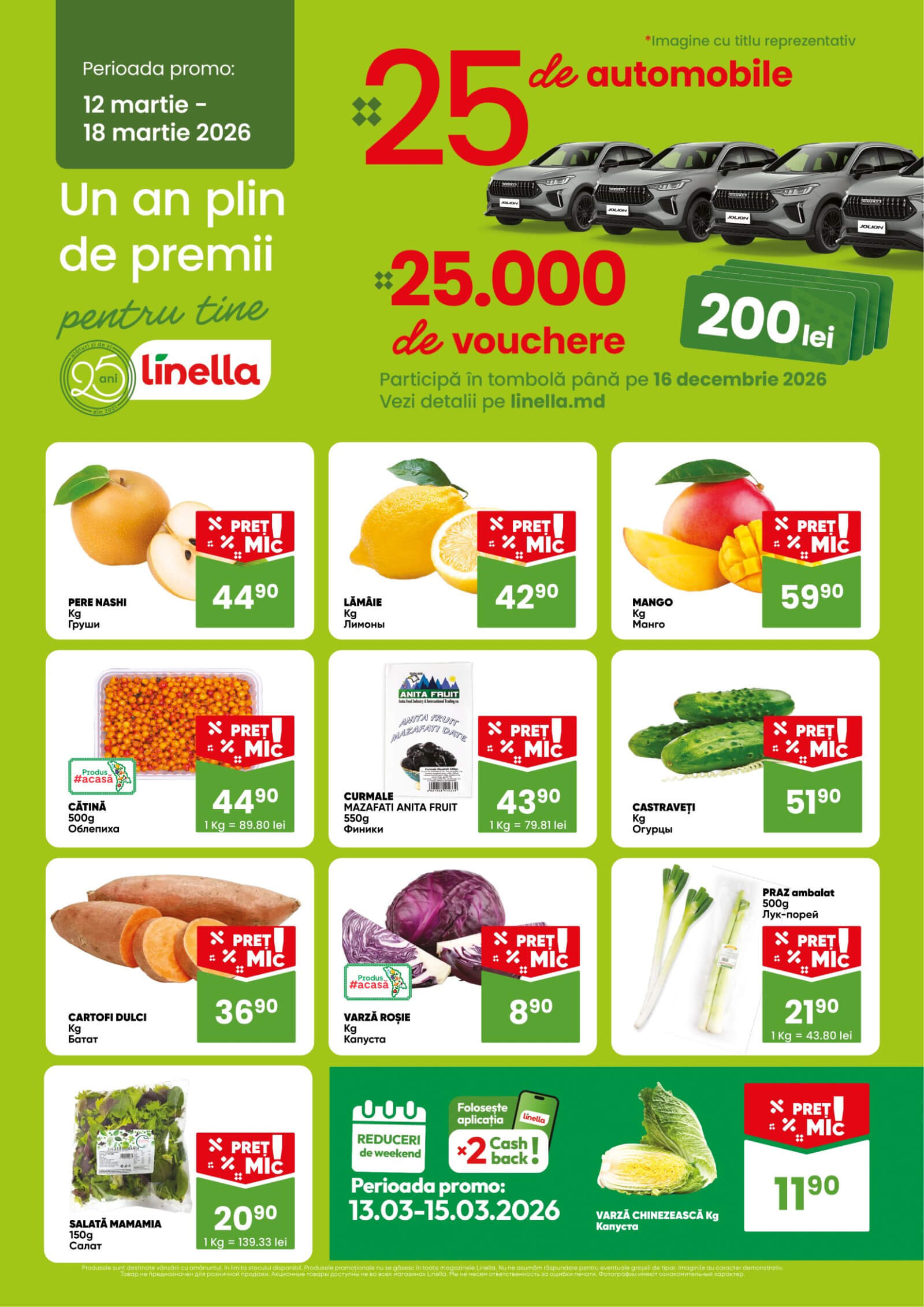 Răsfoiți acest catalog Linella actual în perioada 12.03.2026 - 18.03.2026 pentru a vedea ultimele oferte. În paginile 2 revistei online veți găsi cele mai recente cataloage și oferte din categoria Supermarketuri. Acest catalog Linella oferă reduceri la peste 39 produse la reducere Linella și astfel beneficiați de cea mai bună ofertă la lucrurile pe care le cumpărați! În pagina actuală veți găsi promoții la Cartofi dulci, Curmale, Cătină, mango, lămâie, pere, Verdeață, Verdeață, Varză, Varză chinezească, Varză, castraveți, salată. Catalog Linella oferă multe alte promoții la produse lista o puteti gasi mai jos.
