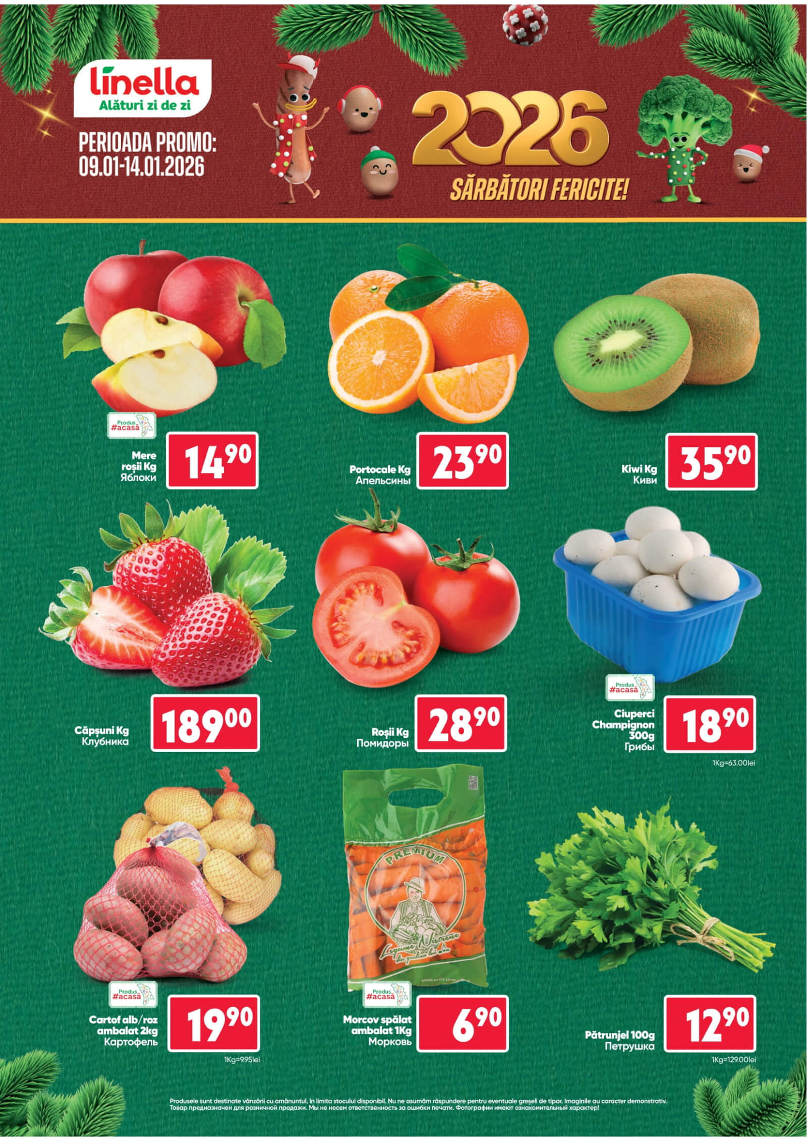 Răsfoiți acest catalog Linella actual în perioada 09.01.2026 - 14.01.2026 pentru a vedea ultimele oferte. În paginile 2 revistei online veți găsi cele mai recente cataloage și oferte din categoria Supermarketuri. Acest catalog Linella oferă reduceri la peste 49 produse la reducere Linella și astfel beneficiați de cea mai bună ofertă la lucrurile pe care le cumpărați! În pagina actuală veți găsi promoții la portocale, mere, Legume, Verdeață, pătrunjel, Legume, Rădăcină, Morcov, Legume, Legume, champignon, Ciuperci, Legume, Roșii, căpşune, kiwi, Cartofi. Catalog Linella oferă multe alte promoții la produse lista o puteti gasi mai jos.