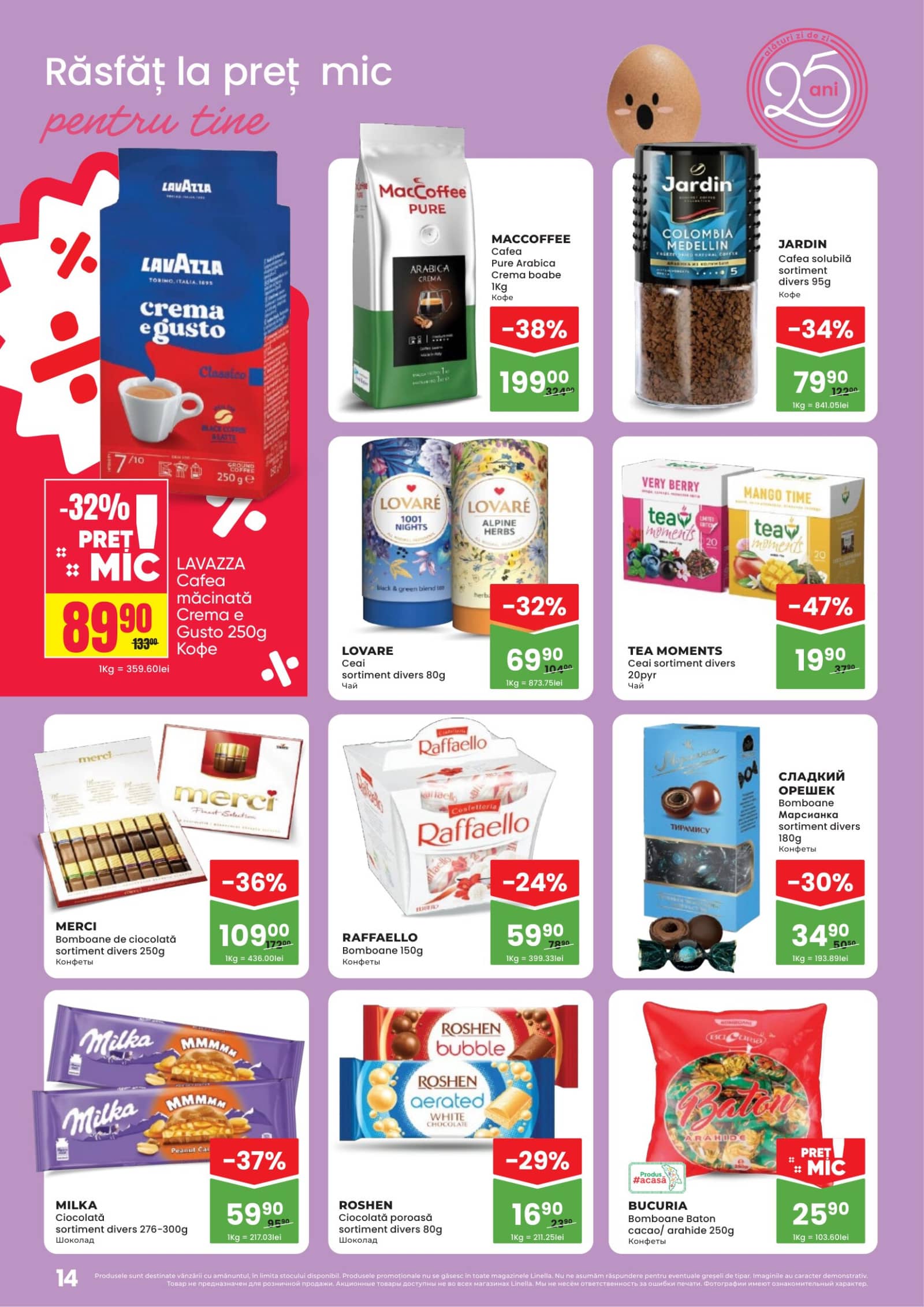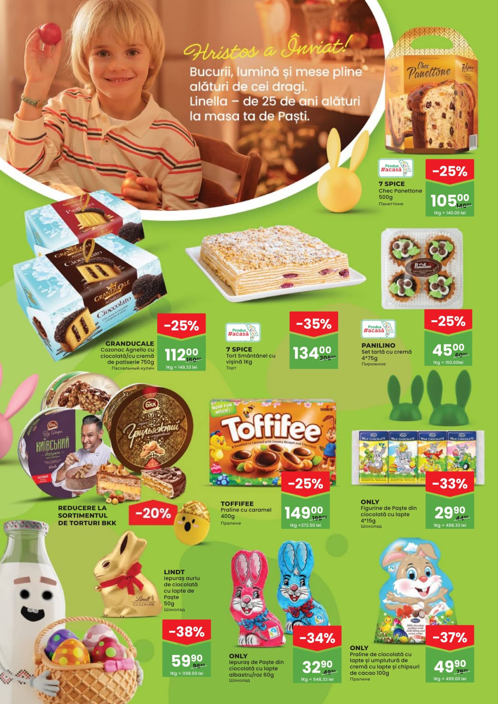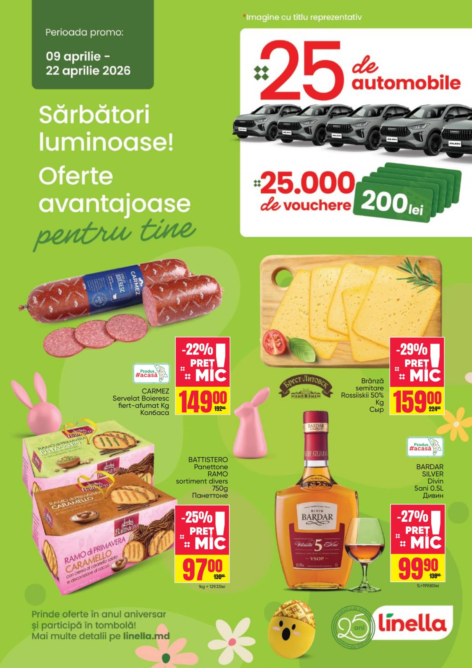 Răsfoiți acest catalog Linella actual în perioada 09.04.2026 - 22.04.2026 pentru a vedea ultimele oferte. În paginile 20 revistei online veți găsi cele mai recente cataloage și oferte din categoria Supermarketuri. Acest catalog Linella oferă reduceri la peste 530 produse la reducere Linella și astfel beneficiați de cea mai bună ofertă la lucrurile pe care le cumpărați! În pagina actuală veți găsi promoții la Produs de patiserie, 3833,Panettone, Brânză, Cașcaval, Salam, Carmez, Salam fiert-afumat, Salam Servelat, brandy, băutură spirtoasă, Divin, V.S.O.P. 5 Ani. Catalog Linella oferă multe alte promoții la produse lista o puteti gasi mai jos.