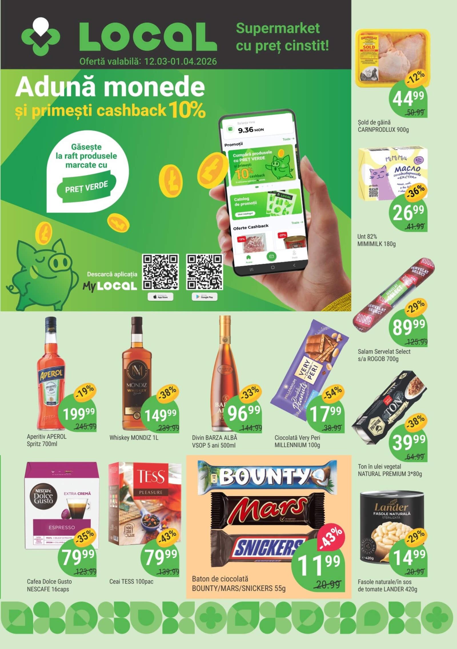 Răsfoiți acest catalog Local Discounter actual în perioada 12.03.2026 - 01.04.2026 pentru a vedea ultimele oferte. În paginile 4 revistei online veți găsi cele mai recente cataloage și oferte din categoria Supermarketuri. Acest catalog Local Discounter oferă reduceri la peste 165 produse la reducere Local Discounter și astfel beneficiați de cea mai bună ofertă la lucrurile pe care le cumpărați! În pagina actuală veți găsi promoții la Ton, fasole, Sos de tomate, Sos, Legume conservate, unt, Produs lactat, Aperol, Aperitiv, băutură spirtoasă, whisky, brandy, băutură spirtoasă, Divin, Salam, Salam Servelat, ciocolată, Bounty, baton de ciocolată, ciocolată, Baton, Cafea, cafea capsule, Nescafé, Ceai, Carne de pui, Șold, Gaina. Catalog Local Discounter oferă multe alte promoții la produse lista o puteti gasi mai jos.