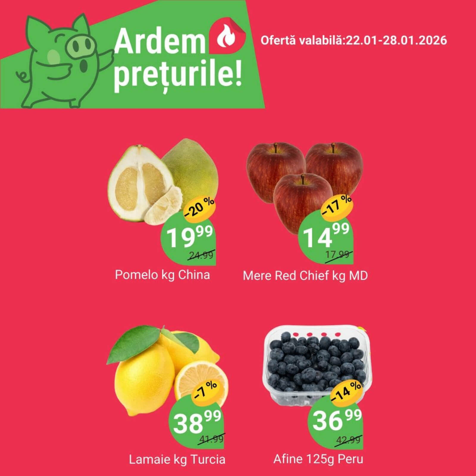 Răsfoiți acest catalog Local Discounter actual în perioada 22.01.2026 - 28.01.2026 pentru a vedea ultimele oferte. În paginile 2 revistei online veți găsi cele mai recente cataloage și oferte din categoria Supermarketuri. Acest catalog Local Discounter oferă reduceri la peste 14 produse la reducere Local Discounter și astfel beneficiați de cea mai bună ofertă la lucrurile pe care le cumpărați! În pagina actuală veți găsi promoții la Pomelo, mere, lămâie, afine. Catalog Local Discounter oferă multe alte promoții la produse lista o puteti gasi mai jos.