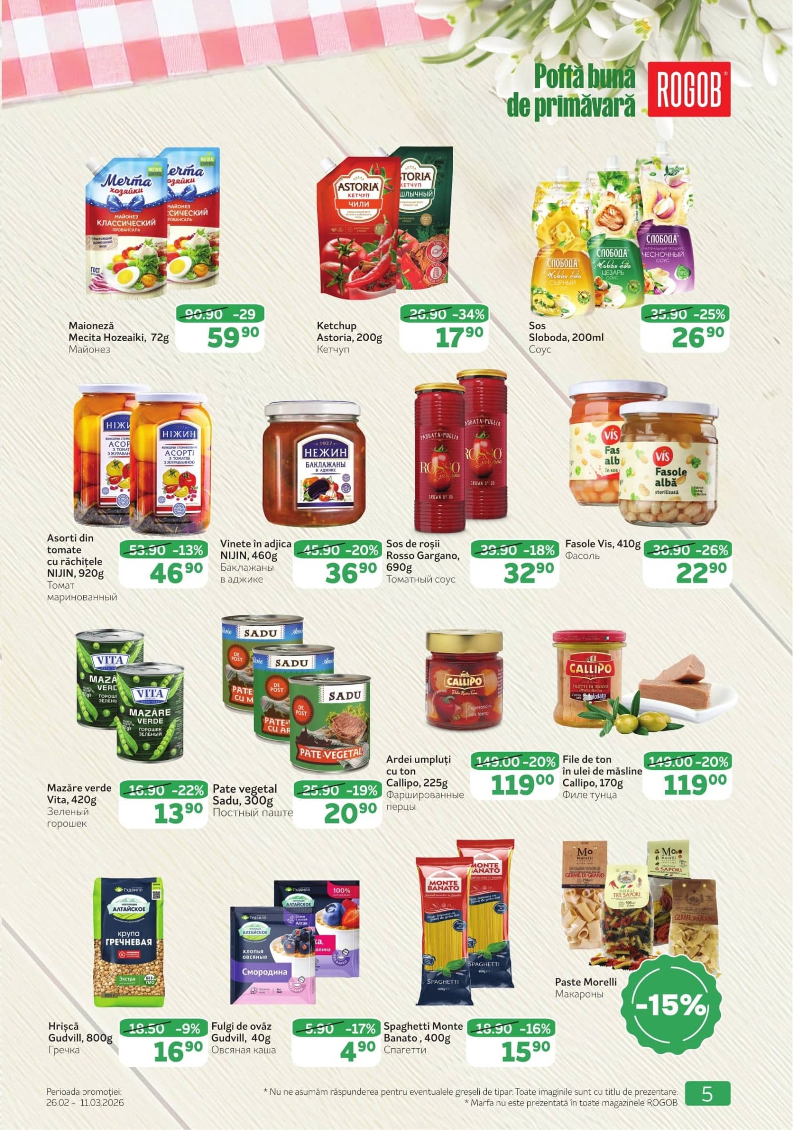 Răsfoiți acest catalog Rogob actual în perioada 26.02.2026 - 11.03.2026 pentru a vedea ultimele oferte. În paginile 8 revistei online veți găsi cele mai recente cataloage și oferte din categoria Supermarketuri. Acest catalog Rogob oferă reduceri la peste 173 produse la reducere Rogob și astfel beneficiați de cea mai bună ofertă la lucrurile pe care le cumpărați! În pagina actuală veți găsi promoții la maioneză, Sos, ketchup, Sos, Sos, Tomate marinate, Legume conservate, zacuscă, Sos, Legume conservate, Sos de tomate, Sos, Passata, fasole, mazăre, Pate, Ton, Gustare de peste, Legume conservate, Ton, Gustare de peste, Hrișcă, Cereale, Mic dejun, Paste, macaroane, Spaghetti, Paste, macaroane. Catalog Rogob oferă multe alte promoții la produse lista o puteti gasi mai jos.