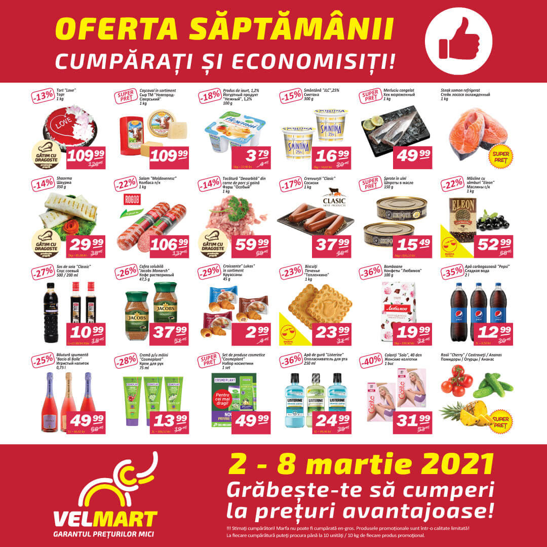 Просмотрите этот каталог Velmart, действительный от 02.03.2021 до 08.03.2021, чтобы увидеть последние предложения. На страницах 0 актуального каталога вы найдете свежие каталоги и предложения из категории Супермаркеты.